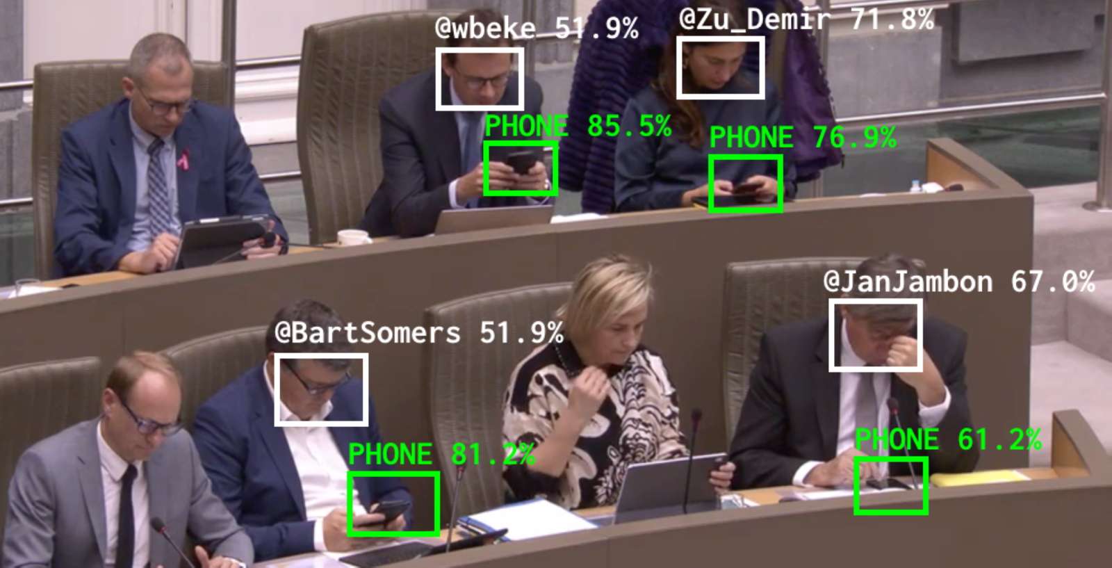 Dries Depoorter created the AI software which scans through all the live Flemish parliament proceedings – which are uploaded to YouTube – and, upon detecting a smartphone, uses facial recognition to determine which politician is not doing their civic duty efficiently.