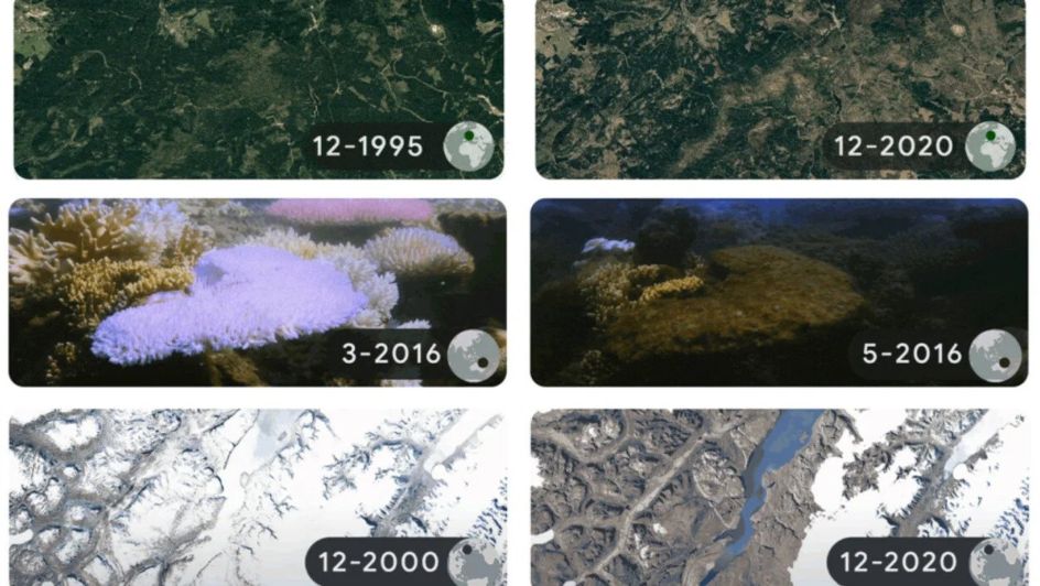 Four locations showing the before-and-after effects of climate change include: Tanzania’s Mount Kilimanjaro from December 1986 to 2020, melted away; Greenland’s glacial retreat from December 2000 to 2020, also severely melted; the Great Barrier Reef’s Lizard Island from March 2016 to October 2017, bleached; and Germany’s Harz Forests between December 1995 and 2020, stripped of its trees.