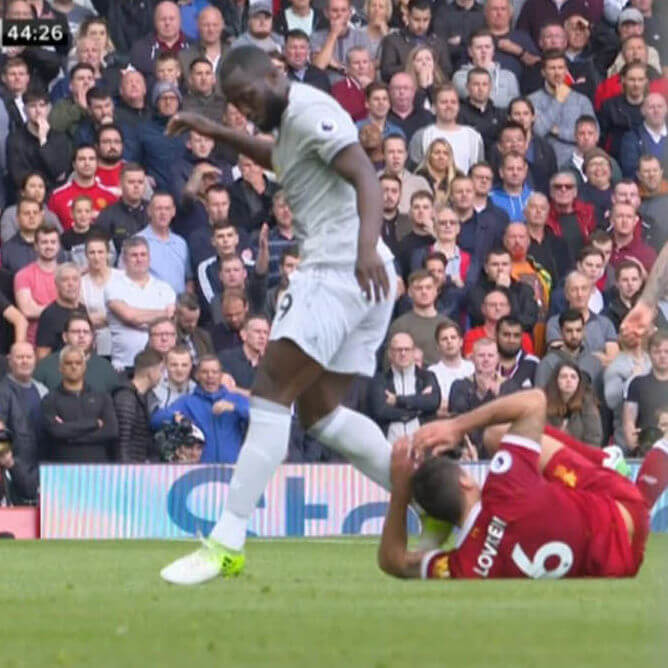 Lovren covered his face and rolled around on the ground in pain, but referee Martin Atkinson judged the contact to be accidental, and did not issue Lukaku with a yellow card.