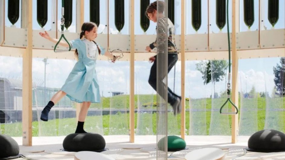 A pump that keeps the castle inflated simultaneously sucks in CO2 from the air. As demonstrated by students from a local primary school, jumping on the castle redirects the CO2 into the algae chambers, which then filters out clean air.